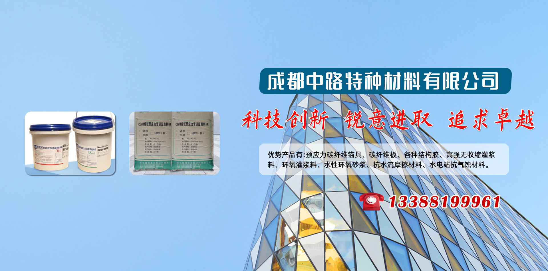 成都中路特種材料有限公司借助清華大學(xué)高分子材料學(xué)科、晨光化工研究院、西南交通大學(xué)、四川交通職業(yè)技術(shù)學(xué)院科研技術(shù)平臺成為一家集新材料研發(fā)、銷售、技術(shù)服務(wù)和施工于一體的專業(yè)服務(wù)公司,優(yōu)勢產(chǎn)品有:預(yù)應(yīng)力碳纖維錨具、碳纖維板、各種結(jié)構(gòu)膠、高強(qiáng)無收縮灌漿料、環(huán)氧灌漿料、水性環(huán)氧砂漿、抗水流摩擦材料、水電站抗氣蝕材料和研發(fā)各種特殊用途膠黏劑產(chǎn)品地處西南腹地成都,業(yè)務(wù)覆蓋四川各大中小城市、重慶、云南、昆明、新疆、西藏等區(qū)域。產(chǎn)品涵蓋各種加固施工材料、施工設(shè)備及施工配件,品牌有威士邦等aa進(jìn)口品牌,同時(shí)批發(fā)銷售國產(chǎn)高、中、低端品牌,為客戶提供全面參考。 成都中路特種材料有限公司為您提供加固行業(yè)的一站式服務(wù)! 如果您面對建筑物加固,不知如何下手,我們將針對您的項(xiàng)目情況,提供全面的技術(shù)指導(dǎo)咨詢,甚至為您量身定做加固方案;如果您面對項(xiàng)目要求,不知如何購買加固材料,我們將根據(jù)您的需要,提供多種參考,從進(jìn)口品牌、國內(nèi)知名品牌到低端產(chǎn)品,一應(yīng)俱全; 如果你萬事俱備,不知何處尋找施工人員,我們可以為您提供具有多年加固經(jīng)驗(yàn)的專業(yè)隊(duì)伍;中路特種材料致力于為客戶提供全方位的建筑物加固解決方案。 成都中路特種材料有限公司是一座橋,一座連接廠家與用戶的橋,以質(zhì)量求生存,以信譽(yù)圖發(fā)展,成都中路特種材料有限公司期望用真摯的服務(wù)筑起一座客戶信任之橋。   科技創(chuàng)新 銳意進(jìn)取 追求卓越!        熱忱歡迎業(yè)內(nèi)專業(yè)人士加盟合作!